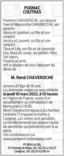 Décédé à Pugnac (33710, France) le mercredi 2 mars 2022 à l'âge de 56 ans
