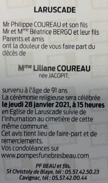 Décédée à La Lande-de-Fronsac (33240, France) le samedi 23 janvier 2021 à l'âge de 91 ans
