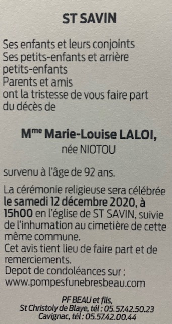 Décédée à Blaye (33390, France) le lundi 7 décembre 2020 à l'âge de 92 ans